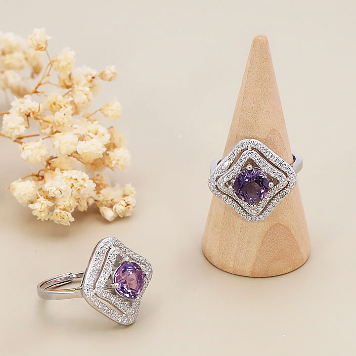 Bague argent 925 rhodié modèle 15 améthyste facettée Brésil AAA (1 pièce) lot N°1A0126