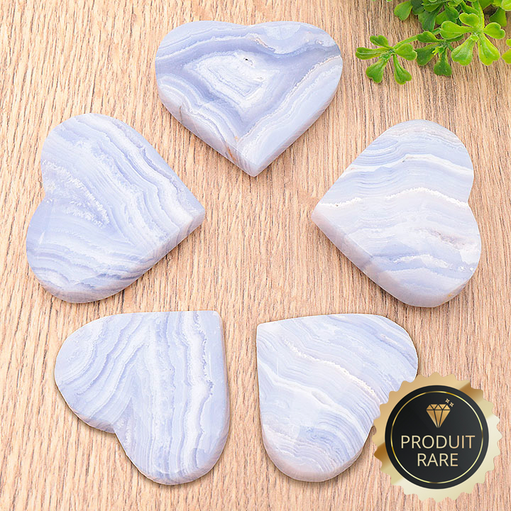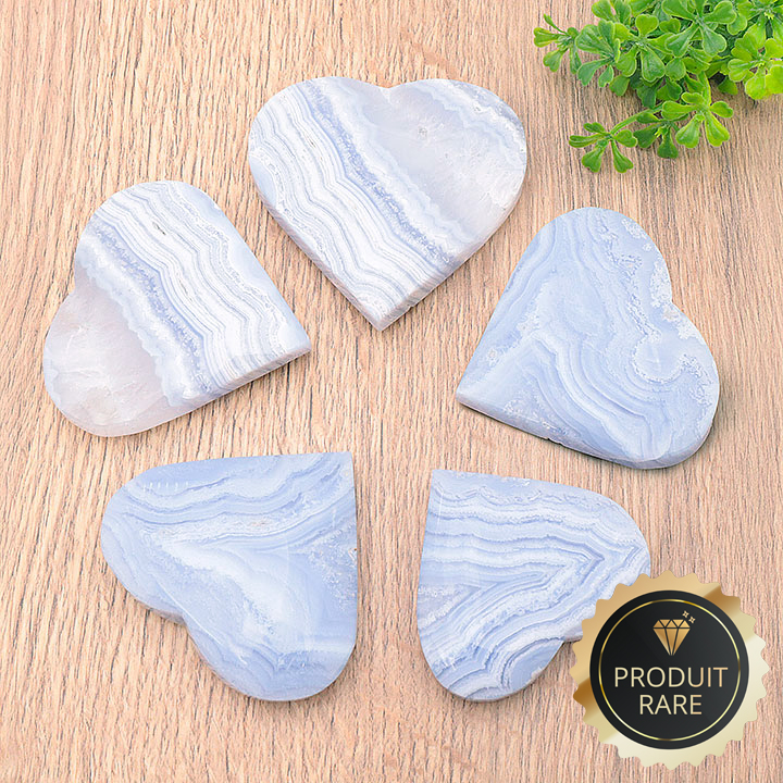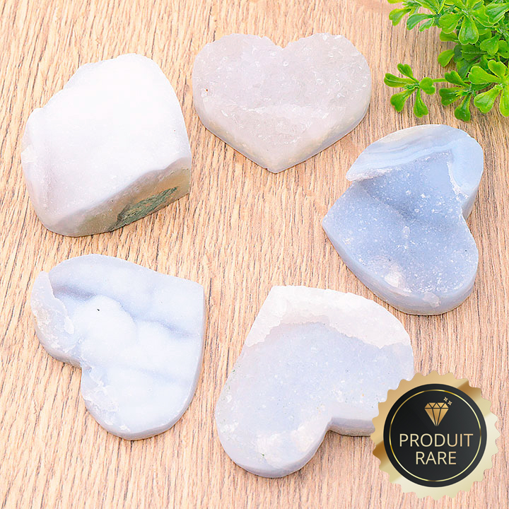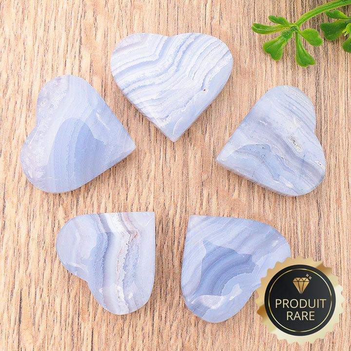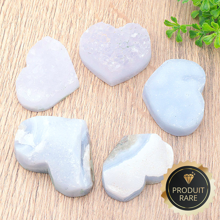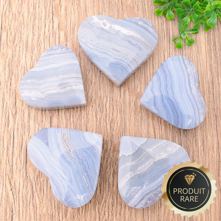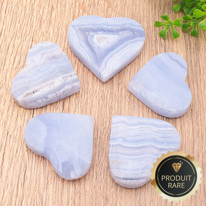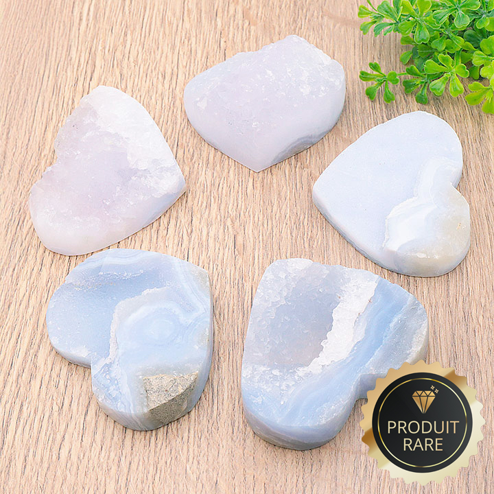 Bracelets et pendentifs en Calcédoine bleue. Perles facettées et pierres roulées.