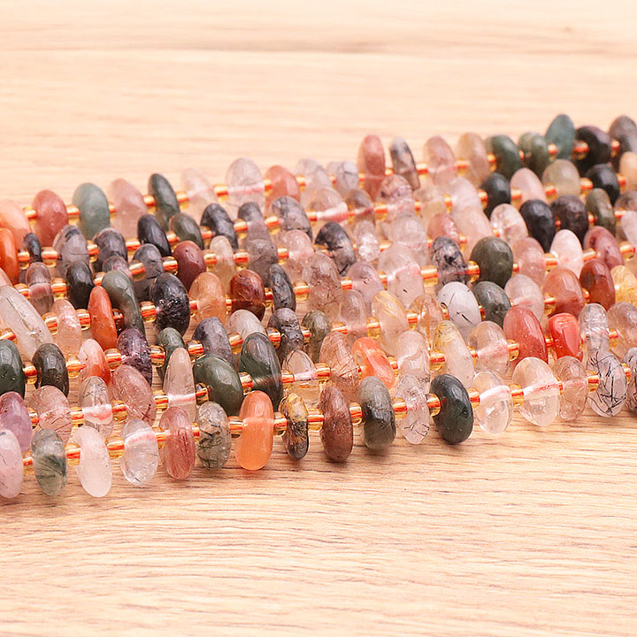 Fil de perles pierres roulées 04 x 10mm cristal de roche rutile multicolore AA