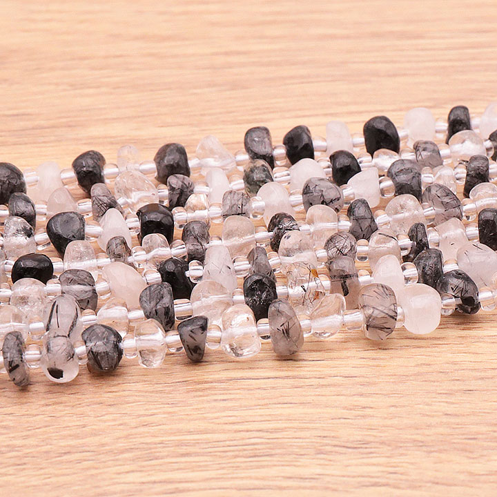 Fil de perles pierres roulées 04 x 10mm cristal de roche tourmaline AA