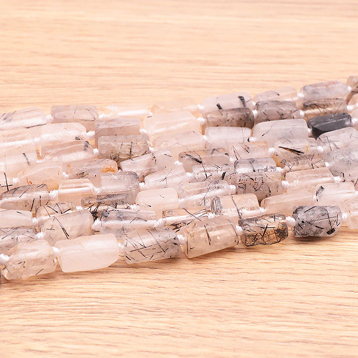 Fil de perles tubes 08 x 12mm cristal de roche tourmaline A