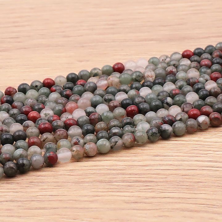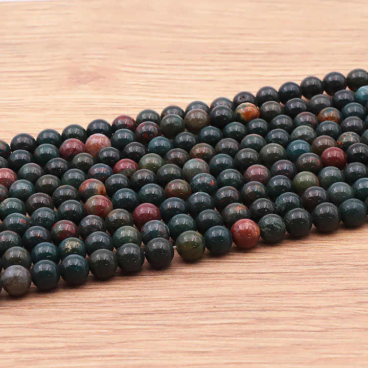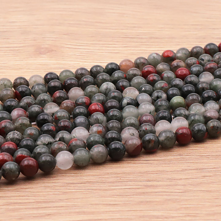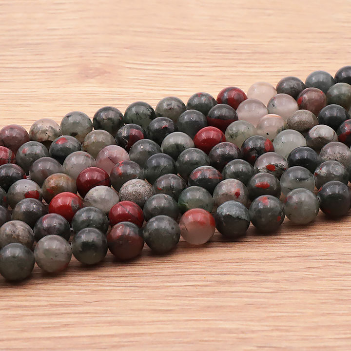 Bracelets, pendentifs et sphères en jaspe héliotrope. Pierres donuts et pierres roulées en jaspe héliotrope.