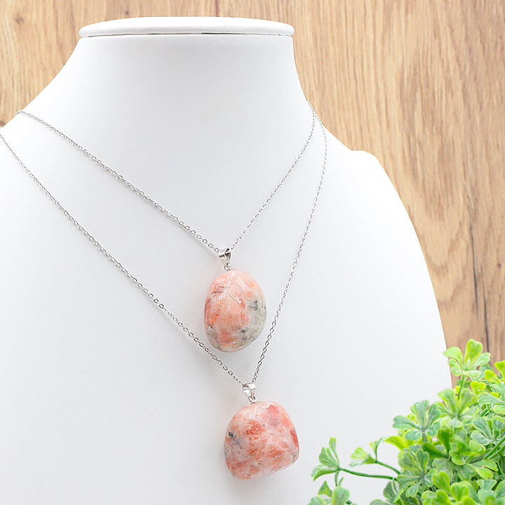 Bracelets et pendentifs en pierre de Soleil. Pierres roulées et perles facettées de pierre de soleil.