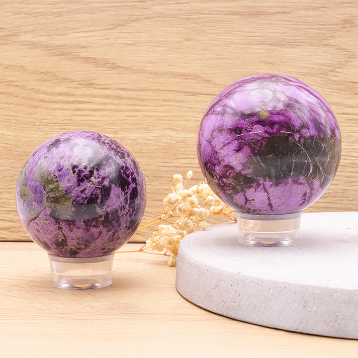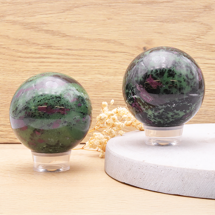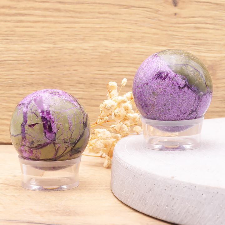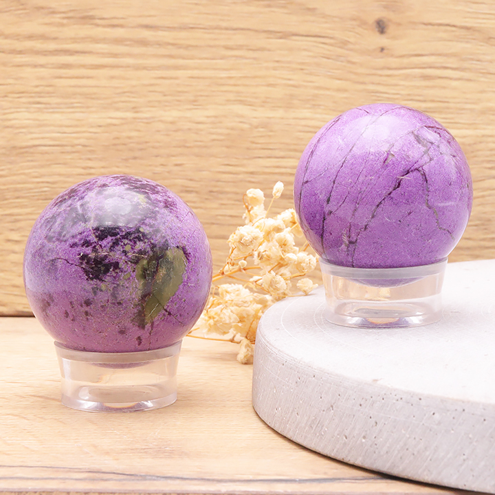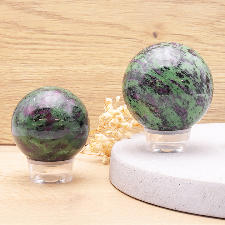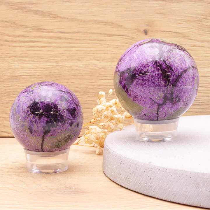 Sphères de cristal de roche, quartz rose, améthyste, œil de tigre, obsidienne, labradorite, malachite, tourmaline noire, pierre de lune,...