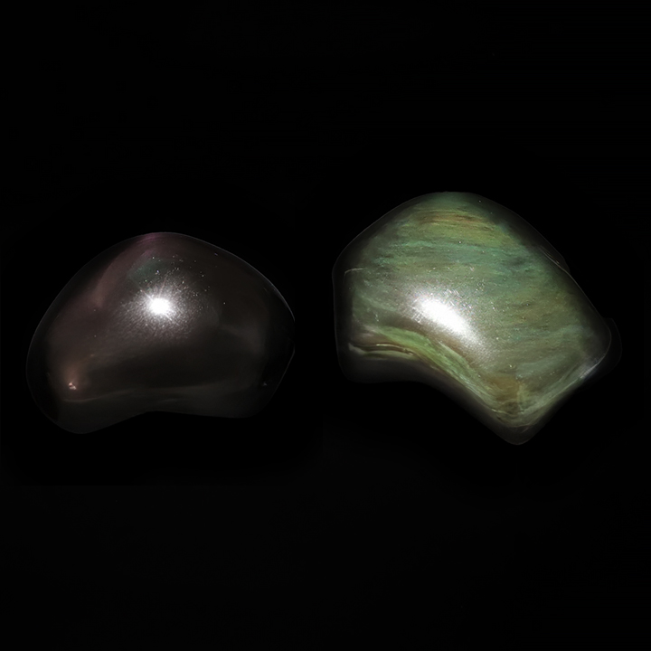 *Les galets ont été photographiés à l'aide d'une source de lumière articficielle afin de faire ressortir au mieux leurs reflets. **Pour des conditions de transport et afin d'éviter les chocs et les rayures, les pierres ont été huilées ; des résidus peuvent-être retrouvés sur les produits. Toutefois, il est possible de les retirer à l'aide d'un chiffon.
