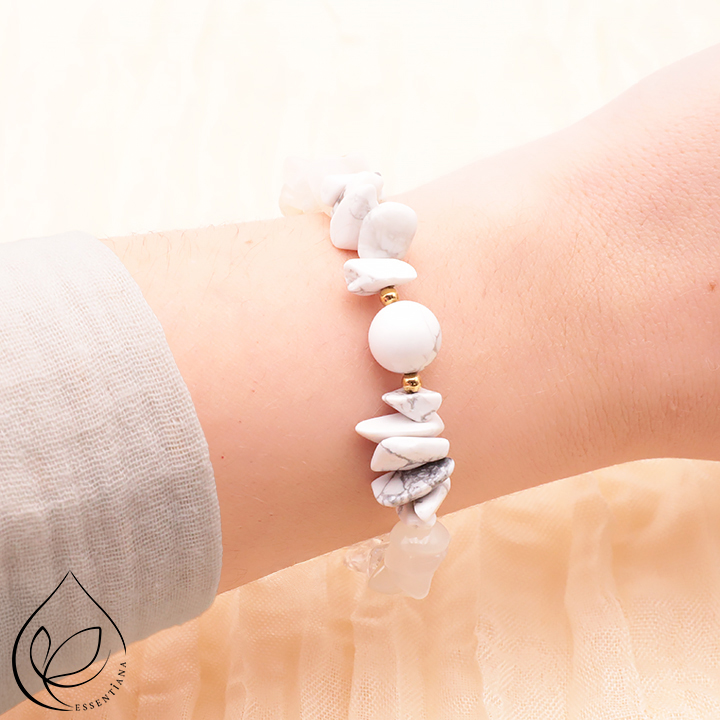 Bracelet Calysta doré cristal de roche, pierre de lune beige, howlite blanche A