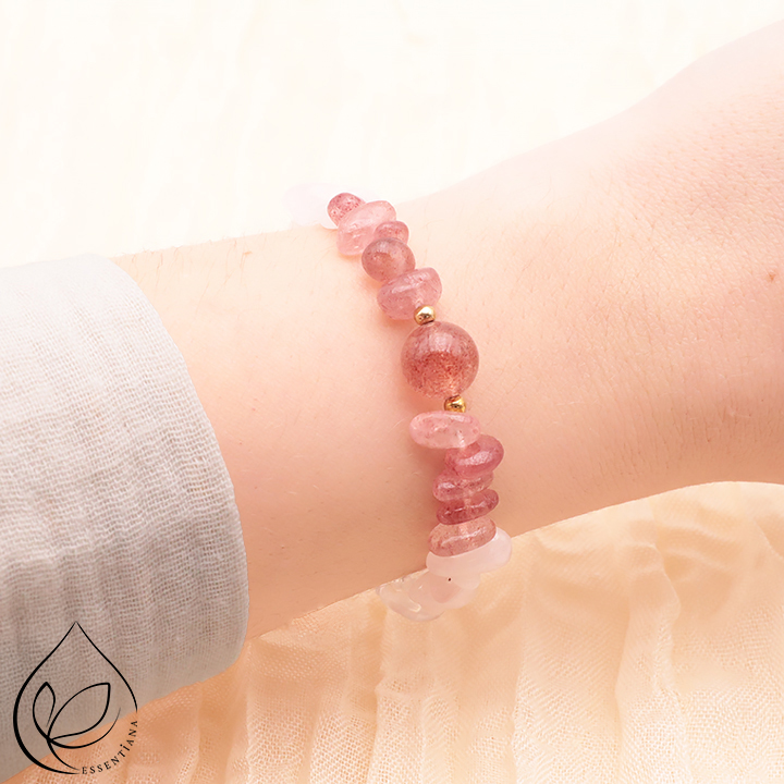 Bracelet Calysta doré cristal de roche, quartz rose, quartz fraise (hématoïde) A