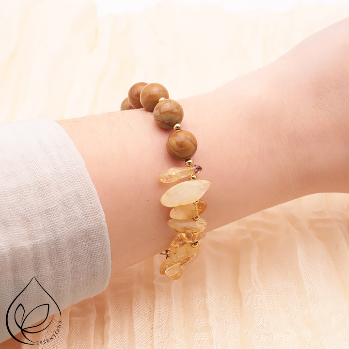 Bracelet Zafya doré citrine chauffée, bois fossile jaune A