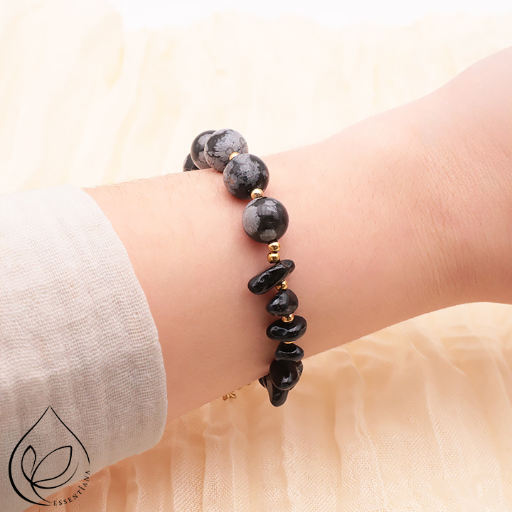 Bracelet Zafya doré onyx, obsidienne flocon de neige A