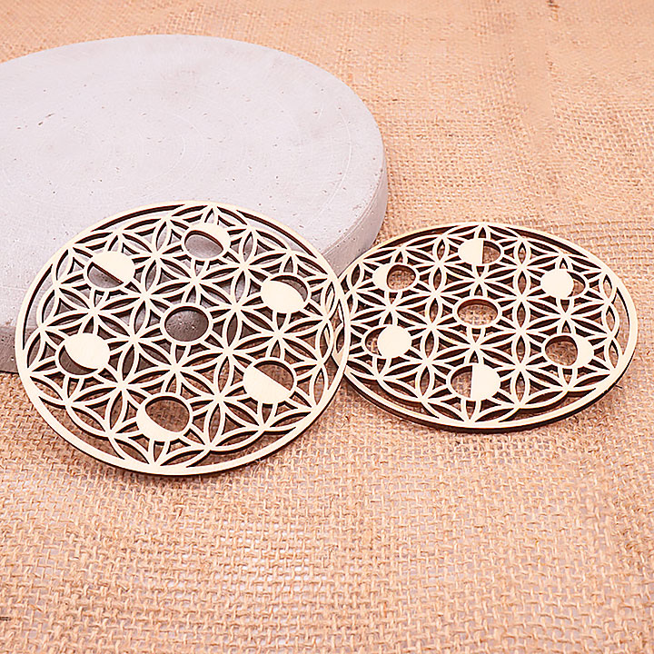 Plaque bois modèle 03 fleur de vie / phase lunaire creuse découpée 100mm (lot 3 pièces)