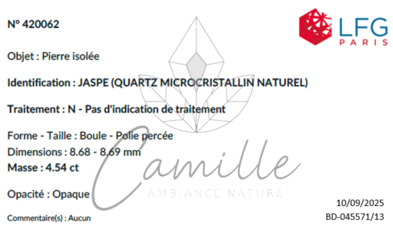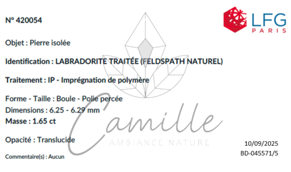 Lors de nos divers arrivages de minéraux, nous sélectionnons un ou plusieurs échantillons parmi l'ensemble d'un même lot, et le(s) soumettons au LGF pour analyse. Nous avons adopté cette méthode de travail afin d'assurer un maximum de sécurité quant à la qualité et l'authenticité de nos pierres. Nous tenons à préciser, qu'au vu des coûts d'analyse, il est évidemment impossible de faire expertiser chacune des pierres ou perles vendues. Cependant cette méthode d'expertise nous permet un contrôle régulier qui favorise la sincérité de nos fournisseurs et la confiance de nos clients.